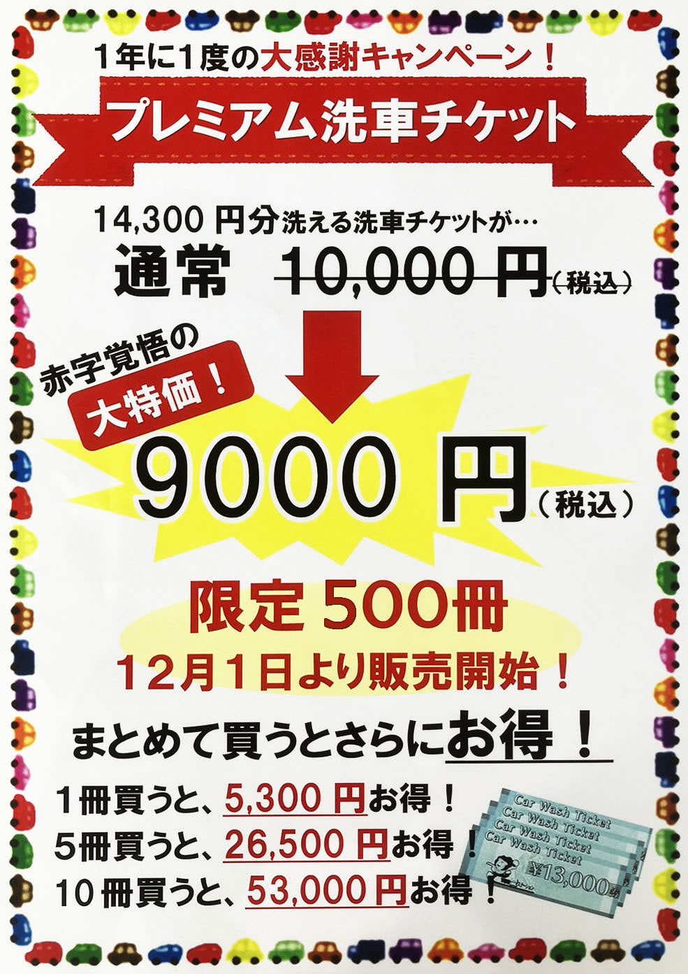 プレミアム洗車チケットが赤字覚悟の大特価です!